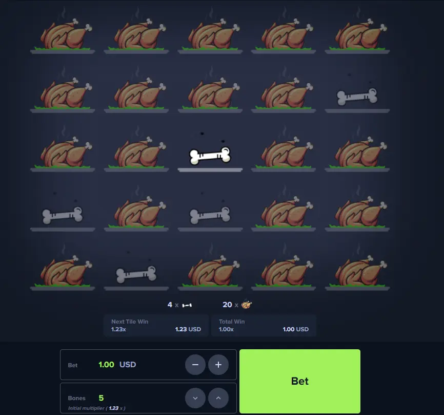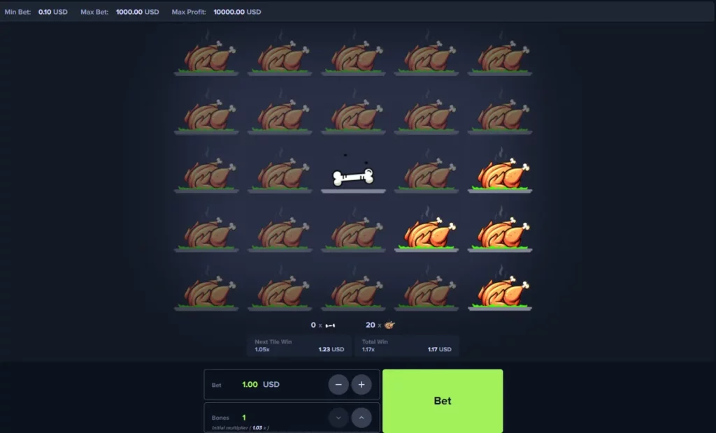 Il y a des os et des images de poulet rôti. Ci-dessous se trouve une petite section qui vous montre combien d’argent vous gagnerez si vous devinez le prochain choix et vos gains globaux. En bas, vous pouvez choisir des variables – montant de la mise et nombre d’os (de 1 à 24).